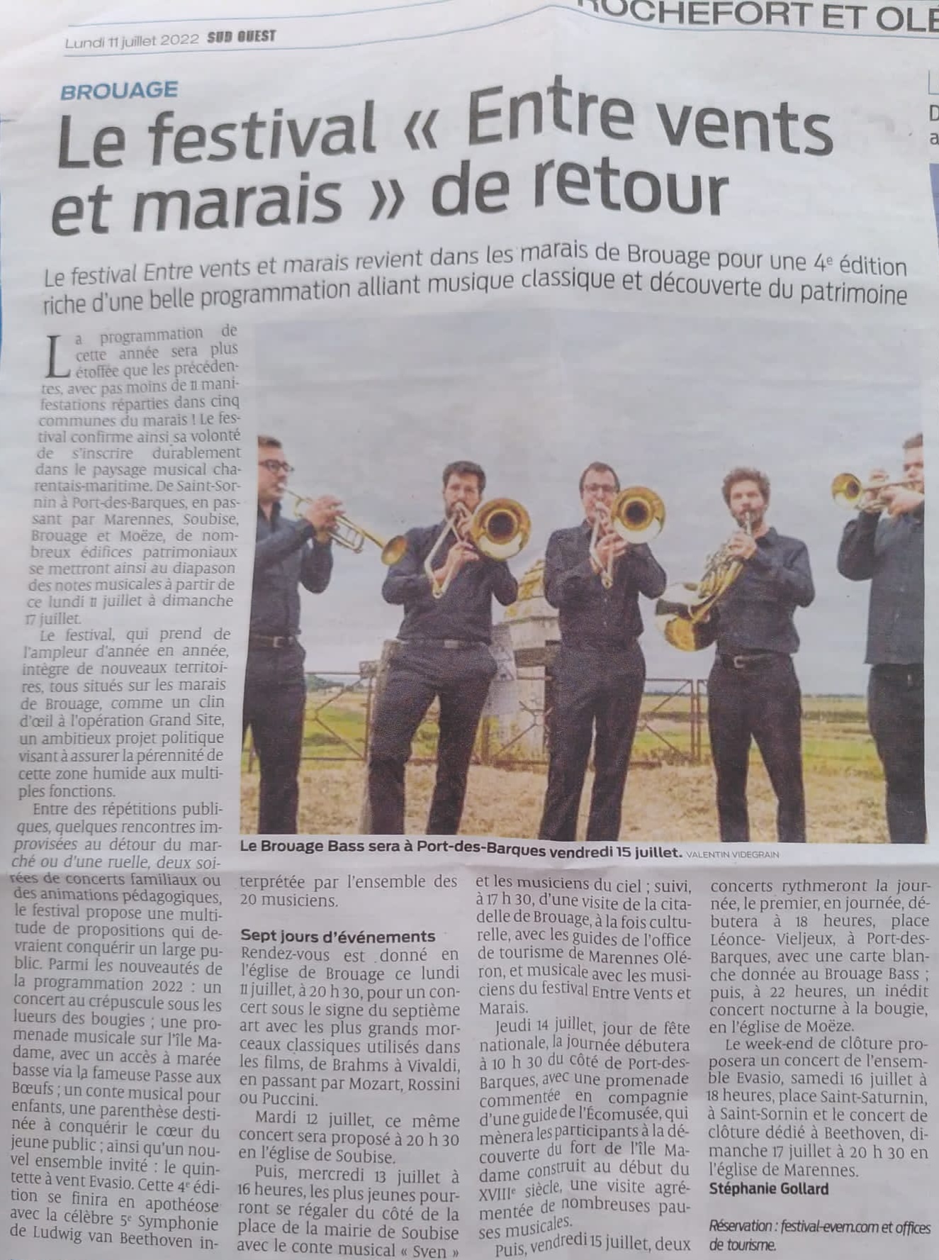 l’Ensemble Brouage Brass : formation de cuivres et percussions. Celui-ci étant spécialement dédiée au festival Entre Vents et Marais. Les musiciens qui le compose mènent des carrières reconnues en France et à l’étranger. Pouvant les retrouver aussi bien en orchestre, qu’en tant que chambristes ou pédagogues.